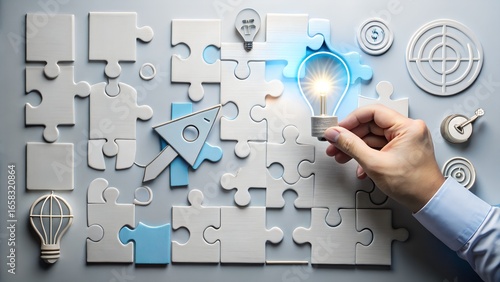 Creative Problem Solving Concept with Puzzle Pieces Lightbulb Target and Hand Placing the Final Piece