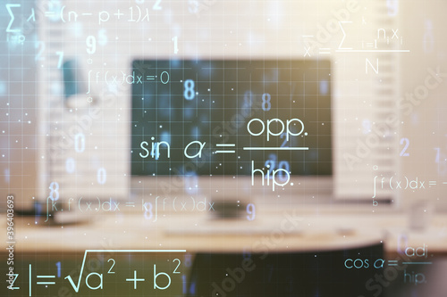 Creative scientific formula concept on modern laptop background. Multiexposure