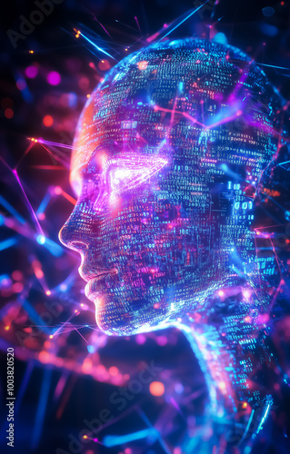 Creative visualization of an artificial intelligence figure made from binary data and advanced computational structures.