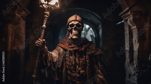 Creepy skeleton warrior exploring dark scene - Generative AI