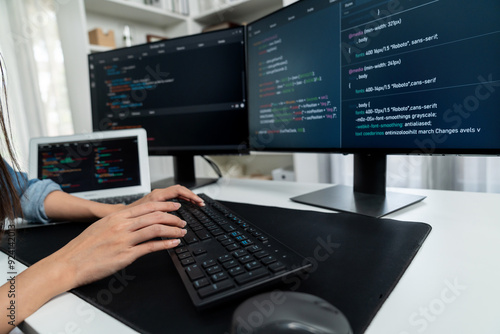 Cropped hands image of IT developer creating with typing information on pc with coding program information data website application, wearing jeans shirt surround safety analysis two screen. Stratagem.