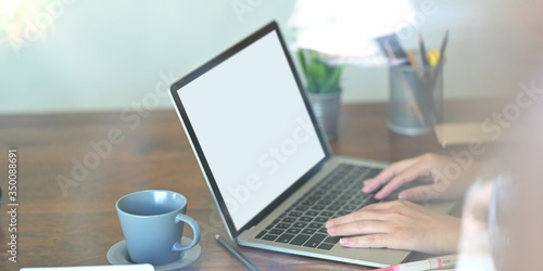 Cropped image of beautiful woman typing on white blank screen computer laptop that putting on wooden working desk surrounded by potted plant, pencil holder and coffee cup.