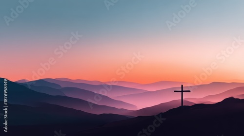 Cross Silhouette Over Mountain Sunset Landscape