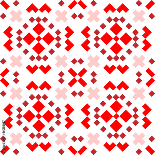 Cross stitch embroidered vector seamless pattern. Abstract geometric ornament in pink and red colors. Embroidery, handmade craft design