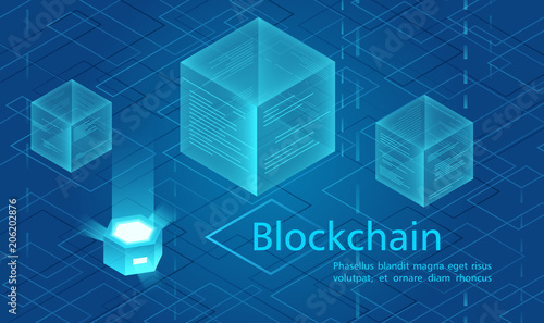 Cryptocurrency and blockchain concept, data powered center, cloud data storage isometric vector illustration. Web design, presentation banner.