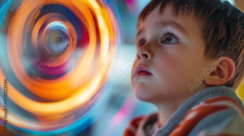 Curious caucasian child observing colorful lights display with wonder