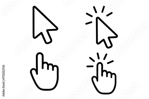 Cursor icon set. Hand pointer and arrow click symbol collection. Mouse computer interface for website navigation. UI UX graphic design element. Vector line art pictogram.