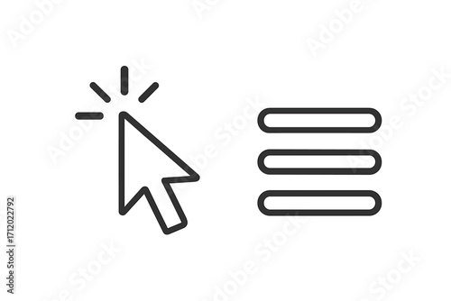 Cursor pointer clicking hamburger menu icon. Line art for web, app interface. UI, UX design element. Navigation button, selection arrow symbol. Vector list, options icon.