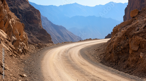 Curving dirt road through mountainous desert landscape