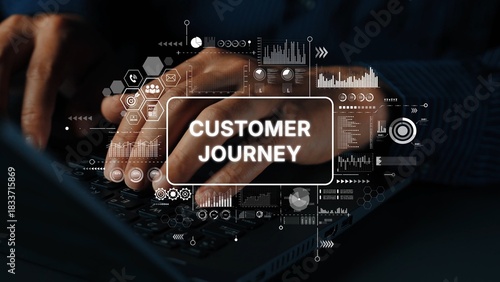 Customer Journey Concepts with Hands on Laptop Keyboard and Data Visualization Elements in Dark Background. Asymptotic smart data analytic.