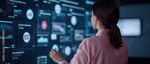 Customer management software projected in midair, user interacting with floating icons and realtime data analytics