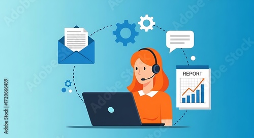 Customer service representative with headset working on laptop surrounded by icons representing communication and data analysis