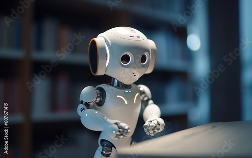 Cute android robot reads the book in the library created with Generative AI technology