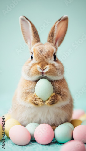 Cute bunny holding egg surrounded by colorful Easter eggs