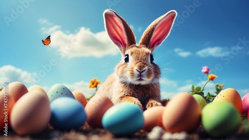 Cute easter bunny with easter eggs fly against the blue sky, banner format.