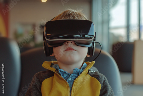 cute little boy in virtual reality glasses at home