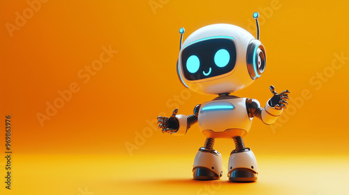 Cute robot. Happy robot assistant. Technologies. Mechanisms. Assistant. Future. Orange background. Intelligence. Robotization.