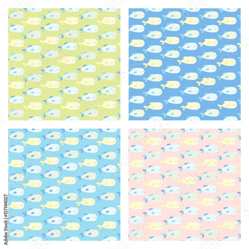 Cute set of four baby seamless vector patterns. Lovely fish on a green, blue and pink backgrounds