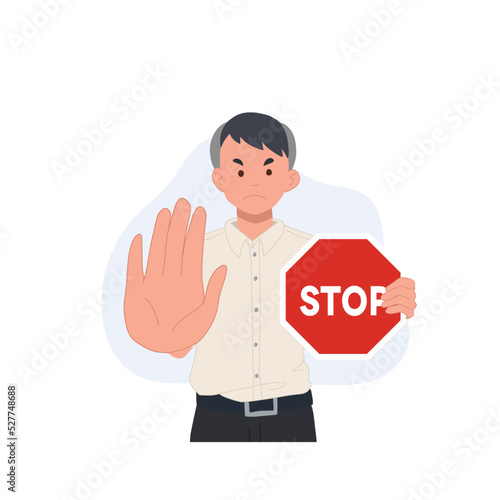 cute Thai student boy doing NO hand gesture ,holding a sign that says "Stop". vector illustration