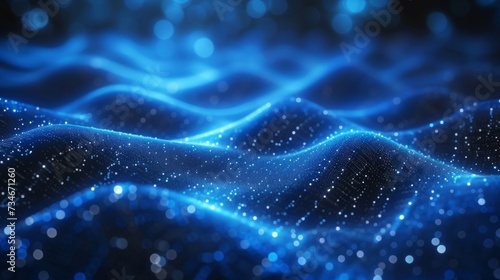 Cutting-edge technology featuring digital waves and neural connections on a dark blue background, symbolizing a global network of quantum computing and AI.
