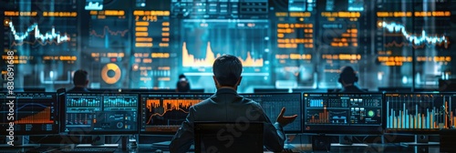 Cutting-edge trading floor, traders using gesture-controlled interfaces to manipulate 3D financial graphs, augmented reality projections