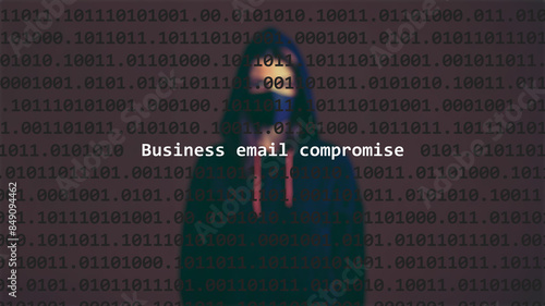 Cyber attack business email compromise text in foreground screen, anonymous hacker hidden with hoodie in the blurred background. Vulnerability text in binary system code on editor program.