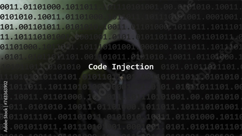 Cyber attack code injection text in foreground screen, anonymous hacker hidden with hoodie in the blurred background. Vulnerability text in binary system code on editor program.