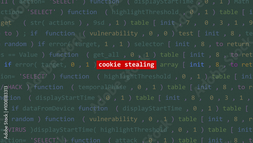 Cyber attack cookie stealing text in foreground screen of code editor developer studio point of vue. Vulnerability text in binary system ascii. Text in English, English text