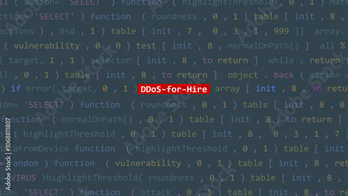 Cyber attack ddos-for-hire text in foreground screen of code editor developer studio point of vue. Vulnerability text in binary system ascii. Text in English, English text