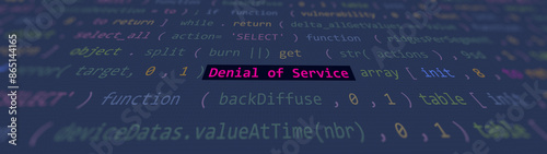 Cyber attack denial of service text in foreground screen of code editor developer studio point of vue. Vulnerability text in attack system ascii. Text in English, English text