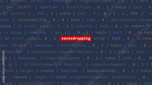 Cyber attack eavesdropping text in foreground screen of code editor developer studio point of vue. Vulnerability text in binary system ascii. Text in English.