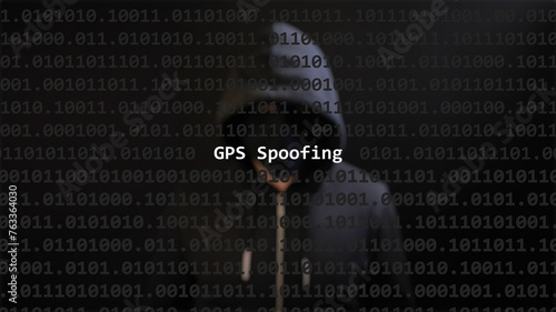 Cyber attack gps spoofing text in foreground screen, anonymous hacker hidden with hoodie in the blurred background. Vulnerability text in binary system code on editor program.