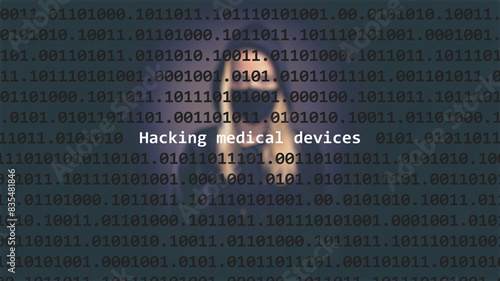 Cyber attack hacking medical devices text in foreground screen, anonymous hacker hidden with hoodie in the blurred background. Vulnerability text in binary system code on editor program.