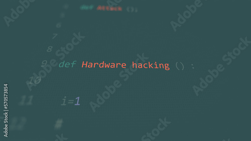 Cyber attack Hardware hacking vunerability in text ascii art style, code on editor screen.