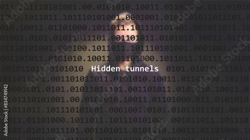 Cyber attack hidden tunnels text in foreground screen, anonymous hacker hidden with hoodie in the blurred background. Vulnerability text in binary system code on editor program.