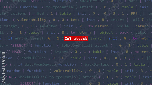 Cyber attack iot attack text in foreground screen of code editor developer studio point of vue. Vulnerability text in binary system ascii. Text in English.