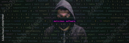 Cyber attack malicious software text in foreground screen, hacker hidden in the blurred background. Vulnerability text in binary system ascii art style, code on editor screen. Text in English