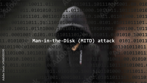 Cyber attack man-in-the-disk (mitd) attack text in foreground screen, anonymous hacker hidden with hoodie in the blurred background. Vulnerability text in binary system code on editor program.
