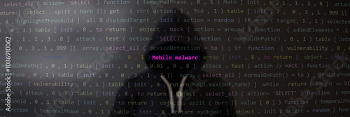 Cyber attack mobile malware text in foreground screen, Anonymous hacker hidden with hoodie in the blurred background. Vulnerability text in binary system ascii art style, code on editor screen.