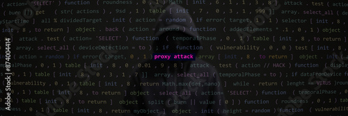 Cyber attack proxy attack text in foreground screen, Anonymous hacker hidden with hoodie in the blurred background. Vulnerability text in binary system style, code on editor screen. Text in English