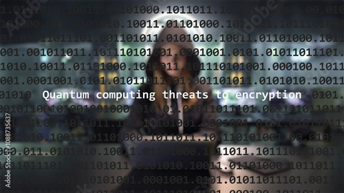 Cyber attack quantum computing threats to encryption text in foreground screen, anonymous hacker hidden in the blurred background. Vulnerability text in binary system code on editor program.
