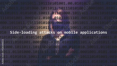Cyber attack side-loading attacks on mobile applications text in foreground screen, hacker hidden with hoodie in the blurred background. Vulnerability text in binary system code on editor program.
