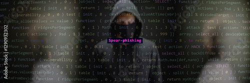 Cyber attack spear-phishing text in foreground screen, hacker hidden in the blurred background. Vulnerability text in binary system ascii art style, code on editor screen. Text in English.