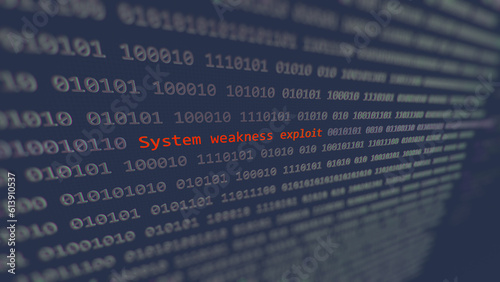 Cyber attack system weakness exploit vulnerability in text binary system ascii art style, code on editor screen.
