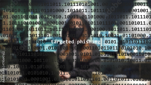 Cyber attack targeted phishing text in foreground screen, anonymous hacker hidden with hoodie in the blurred background. Vulnerability text in binary system code on editor program.