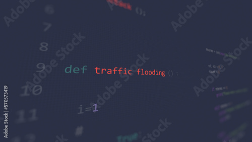 Cyber attack traffic flooding vunerability in text ascii art style, code on editor screen.