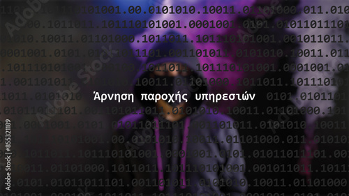 Cyber attack. Translation: denial of service text in foreground screen, anonymous hacker hidden with hoodie in the blurred background. Vulnerability text in binary system code on editor program.