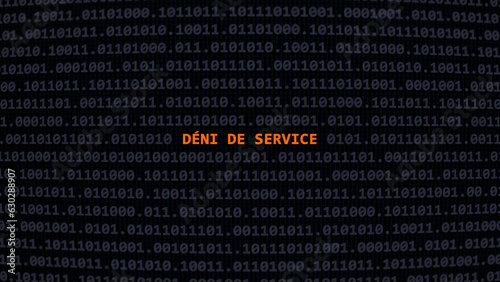 Cyber attack. Translation: denied service. Vulnerability text in binary system ascii art style, code on editor screen.,French language,text in French