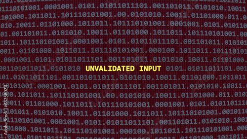 Cyber attack unvalidated input. Vulnerability text in binary system ascii art style, code on editor screen. Text in English, English text