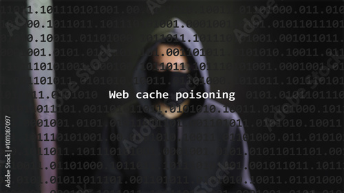 Cyber attack web cache poisoning text in foreground screen, anonymous hacker hidden with hoodie in the blurred background. Vulnerability text in binary system code on editor program.